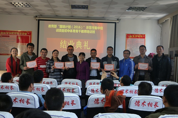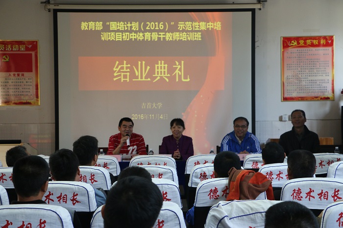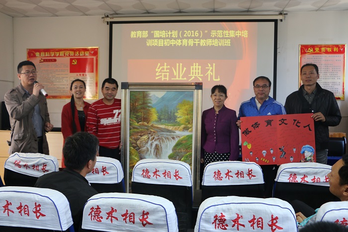 2016年11月4日,教育部“国培计划2016”示范性集中培训项目初中体育骨干教师的最后一个仪式经验交流、学习分享与结业典礼。qy球友会继续教育学院经理田筱鸿、公司党组织书记肖松、副书记吴永海副、办公室主任李政洪、班主任黄文辉老师及王月英老师参与了本次典礼。