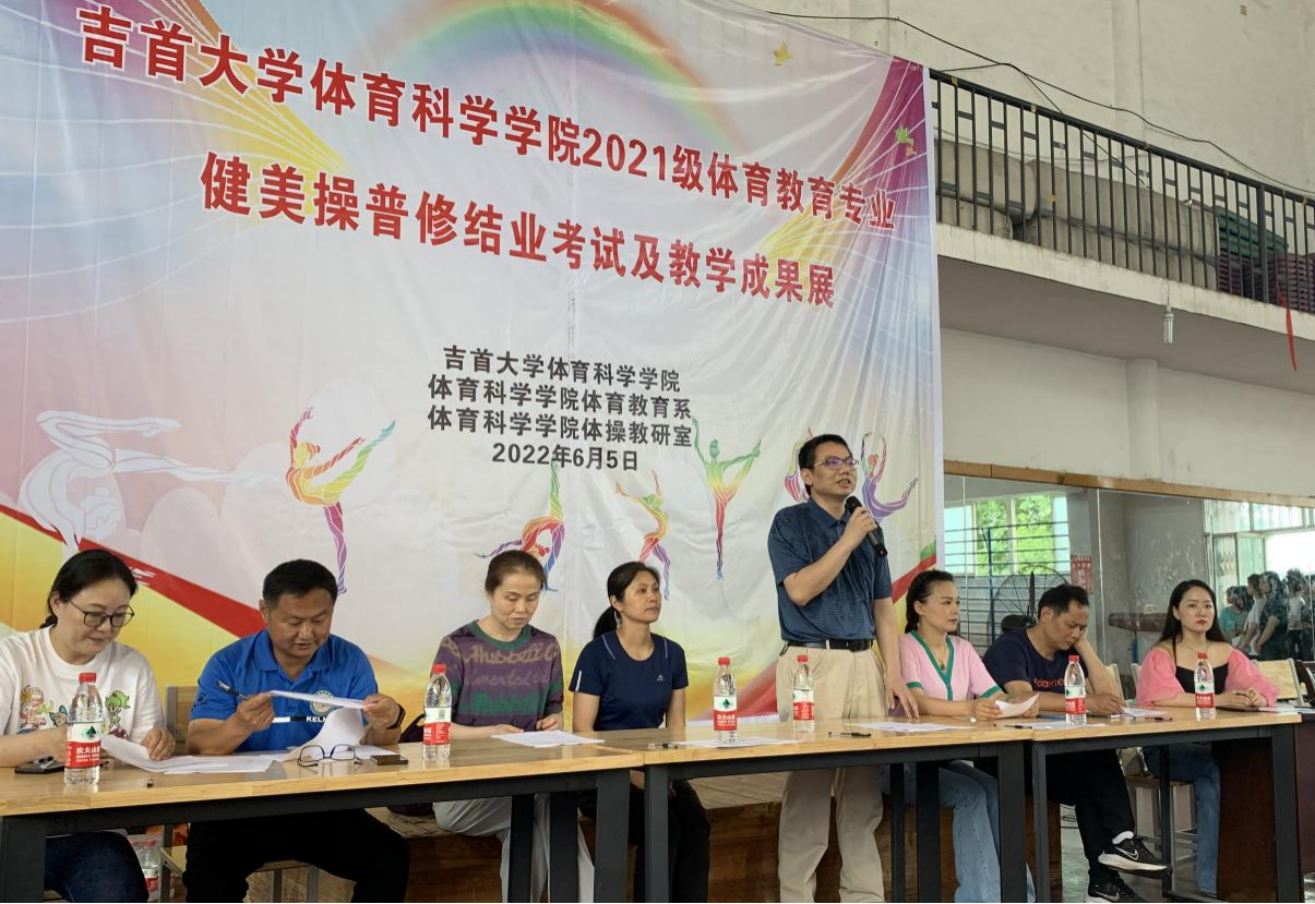 2022年6月5日14:30点,球友会体操教研室在体操馆隆重举行2021级体育教育专业健美操普修结业考试及教学成果展活动。学院副经理万义、体育教育系主任文理中老师、体操教研室主任朱晓红老师、学院教务办王月英老师、体操教研室陆晨教授、王海波老师、田茂林老师、刘生贵老师和覃英老师出席了本次汇报展演。