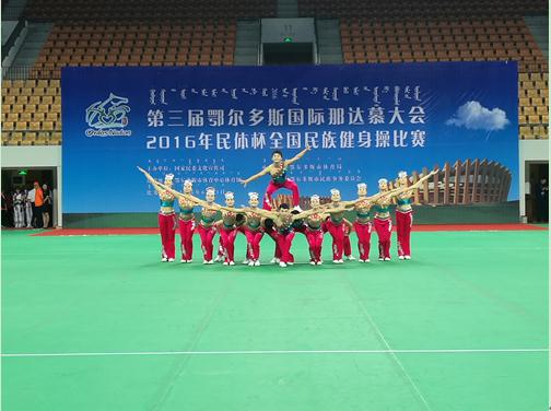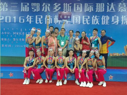 6月23日至6月24日,球友会周道平经理带队参加了在内蒙古鄂尔多斯市举行的2016年“民体杯”全国民族健身操比赛。公司由16名体育专业员工组建的代表队经过4个月的紧张备战和精心准备,代表湖南省在比赛中不负众望,斩获亚军。