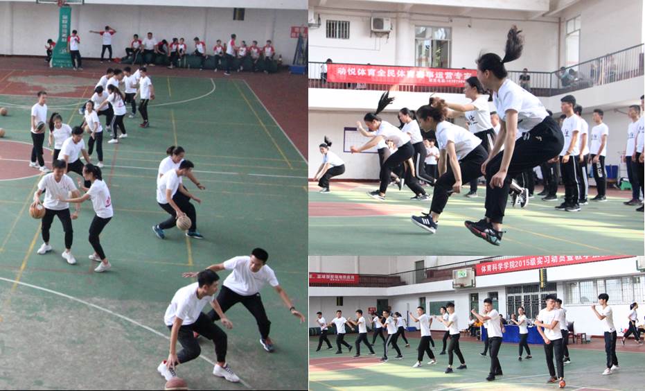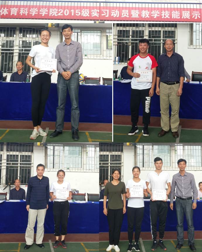 展示内容分为三类,均以抽签形式选择,第一、二类为现场展示项目,第三类为现场评选项目,展示项目每个队两个项目连贯展示。第一类:队列队形、广播体操、实习队特色项目中三选二进行展示,队列队形的指挥员、广播体操口令员抽签决定。第二类:教学技能展示项目包括篮球、田径、健身操、武术、足球、排球,每个队随机抽取一名员工进行展示。第三类:每个员工打印一份游戏设计、一份45分钟教案,现场查看材料进行评选。