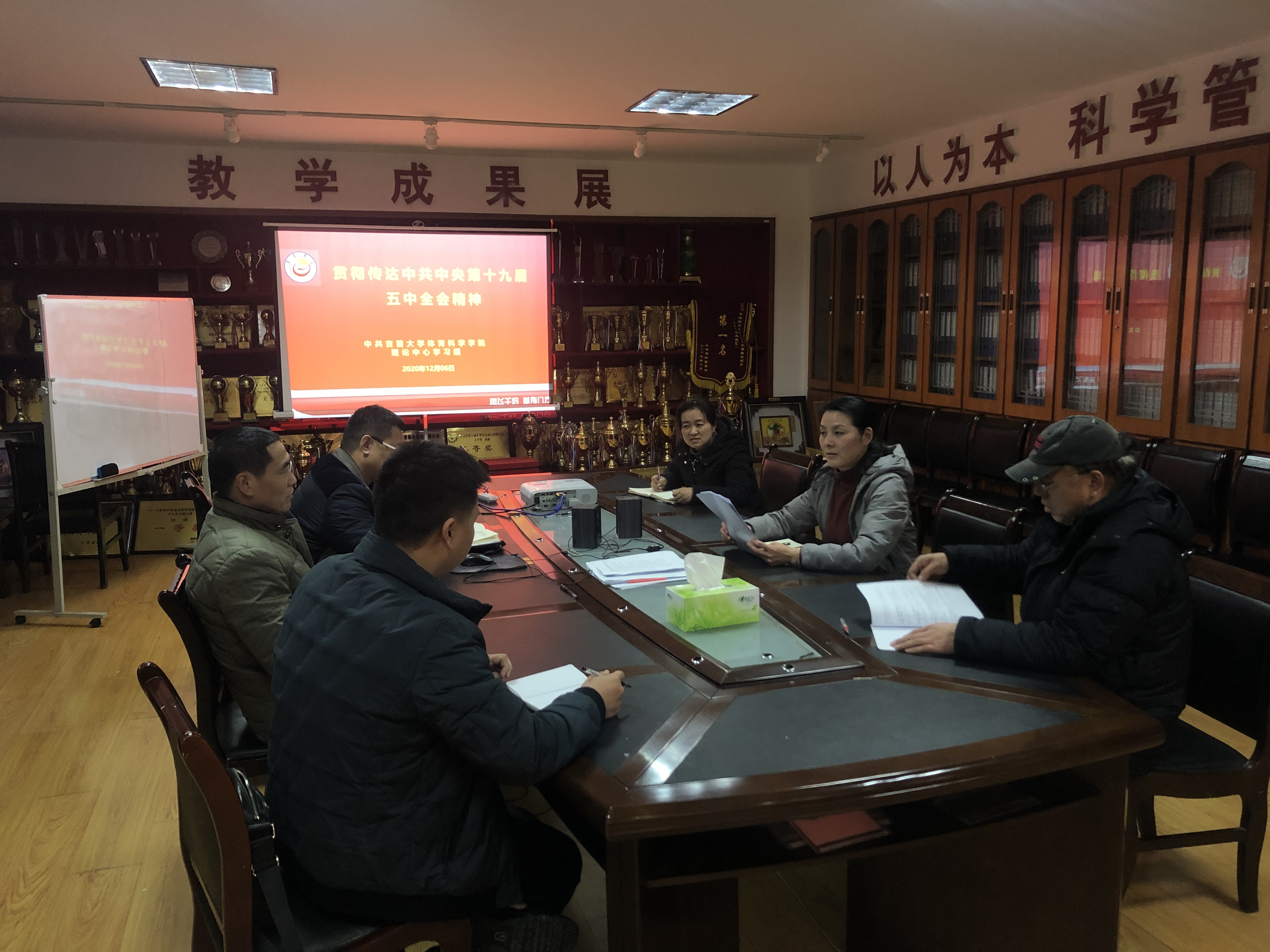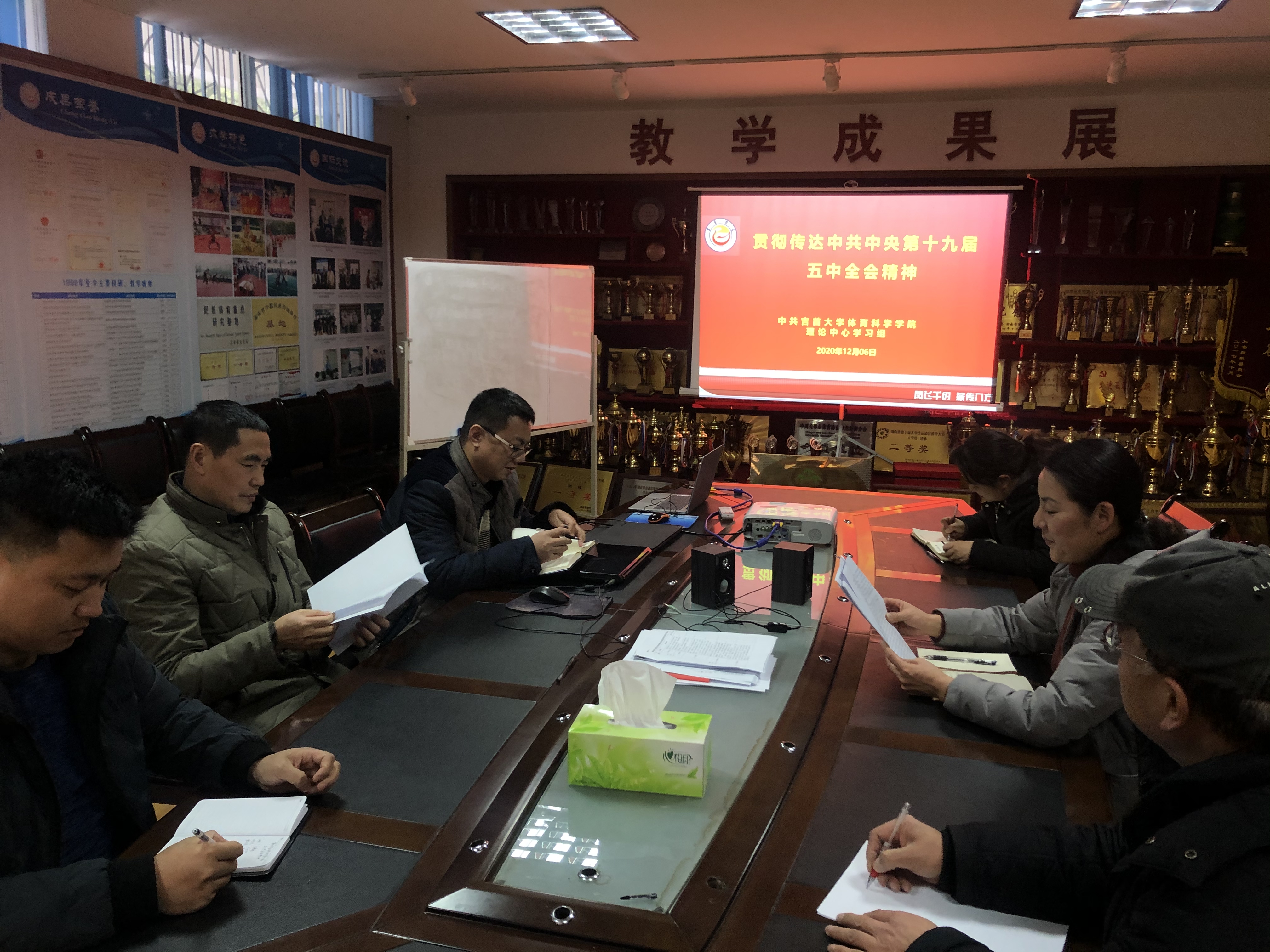 2020年12月14日下午在学院二楼荣展室,学院行政领导班子集中学习贯彻党的十九届五中全会精神,吴湘军书记主持整个学习过程