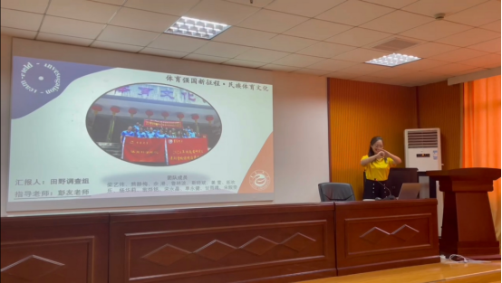 闭幕式开始前,民族体育项目第一、二、三组和田野调查组分别进行了成果汇报。项目二组进行理论课学习感悟反思总结的汇报,并将所学板鞋、花样跳绳、霸王鞭等传统体育项目进行了展示;项目三组将汇演分为团队介绍、理论感悟、实践学习、博物馆参研、小组汇演五个模块,以文筑基、以武汇演,践行体育文化人的誓言。项目一组将暑期培训的点点滴滴一一展现在大家面前,以《八段锦》汇演收尾。田野调研组以“鼓”为线,以《保靖县葫芦镇体育非遗文化苗族鼓舞的田野调查报告》为题,从理论学习、田野点概况、田野调查实践报告三个方面进行汇报。