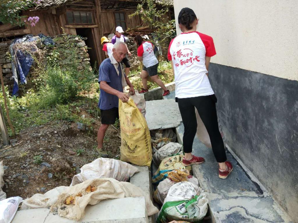调研过程中,志愿者来到花桥村当地孤寡老人家中为其搬运为其搬运刚刚收割的几百斤玉米,在志愿者的共同努力下将老人的玉米很快都被搬运到家。烈日当头,志愿者的们早已大汗淋漓,看着老人慈爱的笑容他们早已忘记了炎热和疲惫。据了解到老人是一名孤寡老人,独自在这个村庄生活了几十年,靠着国家的贫困补贴和养老金才勉强度日。为了进一步帮助这位孤寡老人,接下来的几个小时里志愿者们继续帮助老人直至干完所有农活。