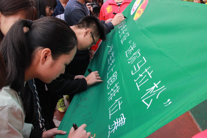 然后,领导老师为运动员代表佩戴徽章,各代表队在活动旗上签名。