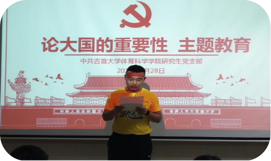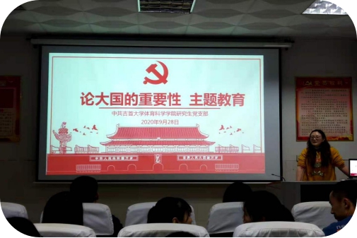 2020年9月28日,球友会研究生党支部在院三楼开展“论大国的重要性”主题教育活动,会议由研究生党支部书记覃英老师主持。