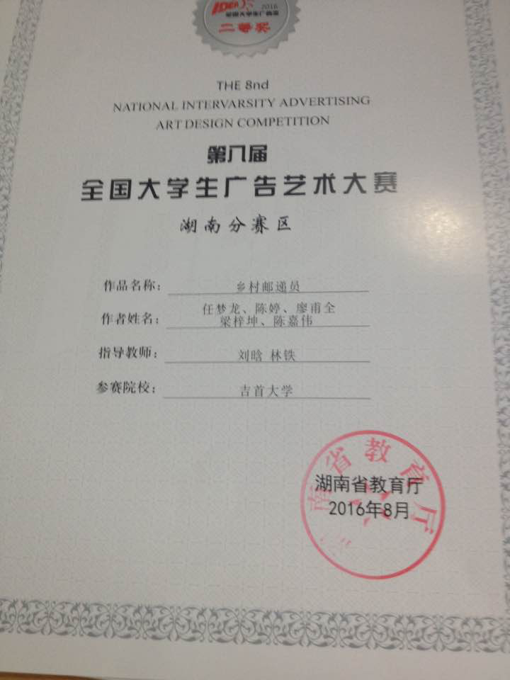 2.2016年8月在第八届全国老员工广告艺术大赛湖南赛区中参赛作品被湖南省教育厅评为二等奖