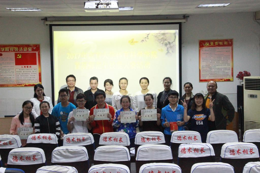(本网讯:陈宝玉)5月7日下午14:30,在学院三楼多媒体教室举行了2017年度球友会“首届师范生技能综合大赛”的决赛。出席本次大赛的院领导有周道平经理,张小林副经理、吴湘军副经理,承办单位是体育人文教研室,协办单位是院学工办、院教务办。评委由体育人文教研室全体教师和学工办宁姗姗、彭友老师及教务办王月英老师组成。