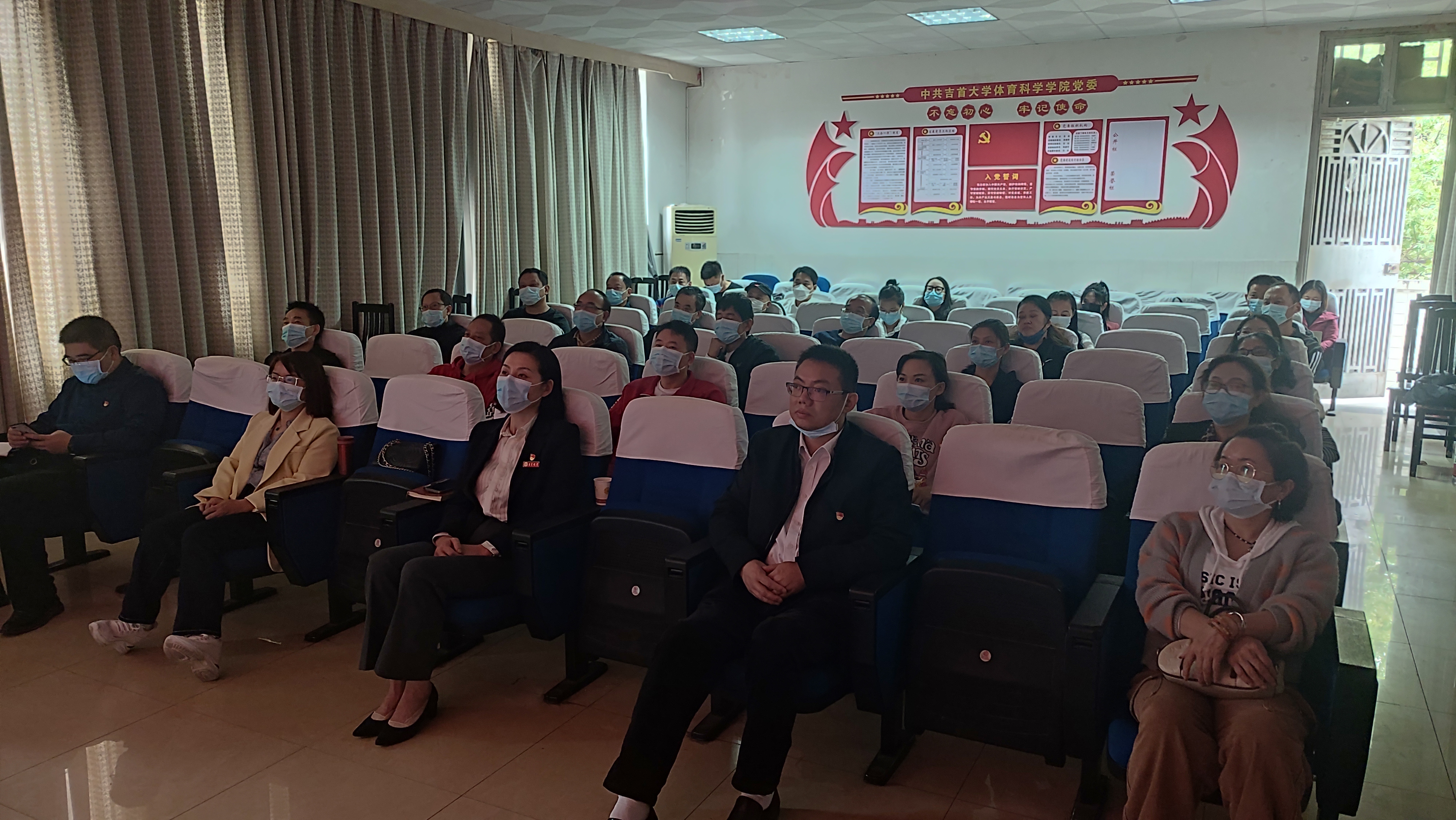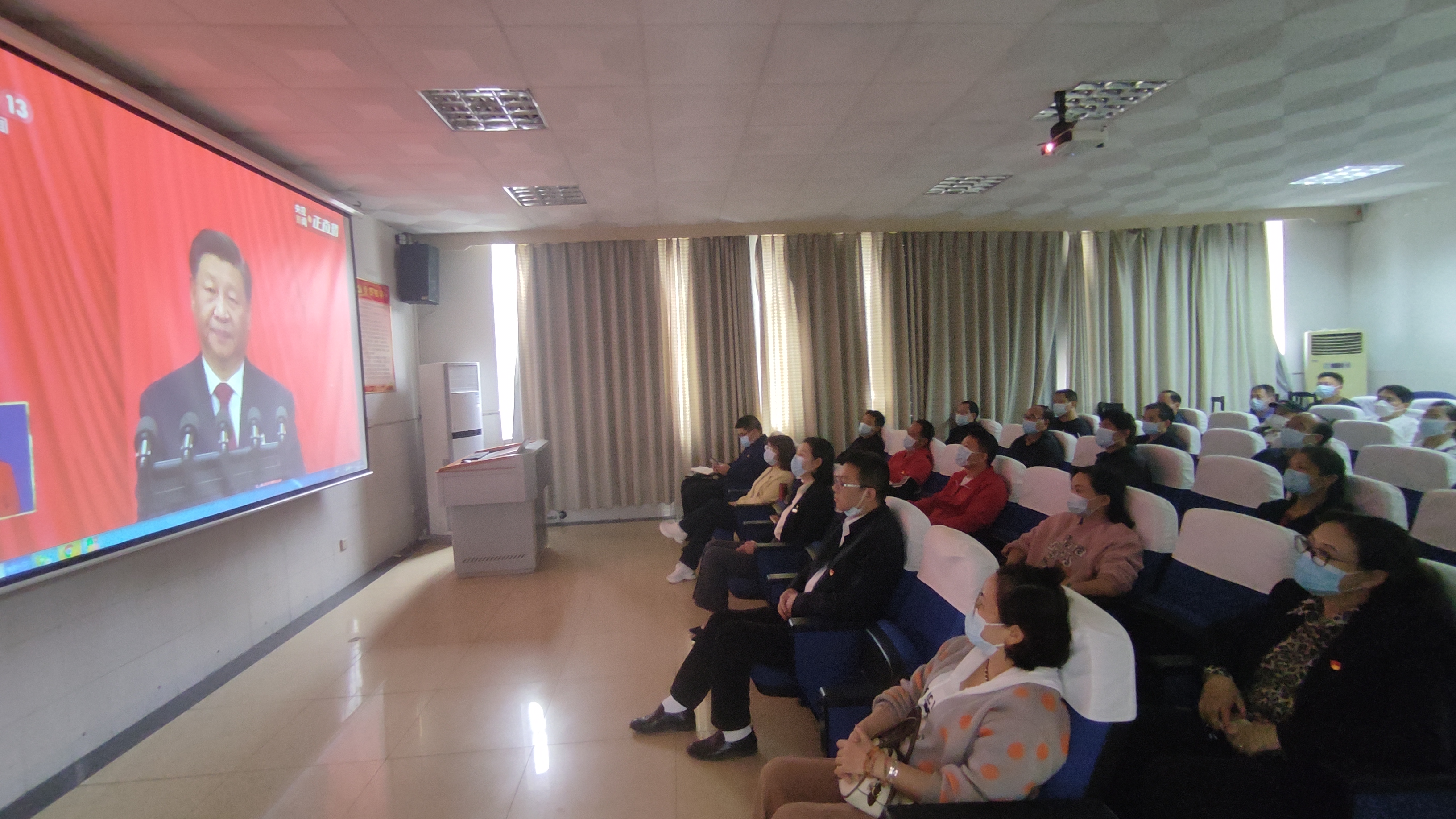 上图为 院领导班子成员、全体教工党员集中收看党的二十大开幕会的会场