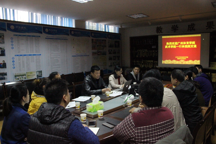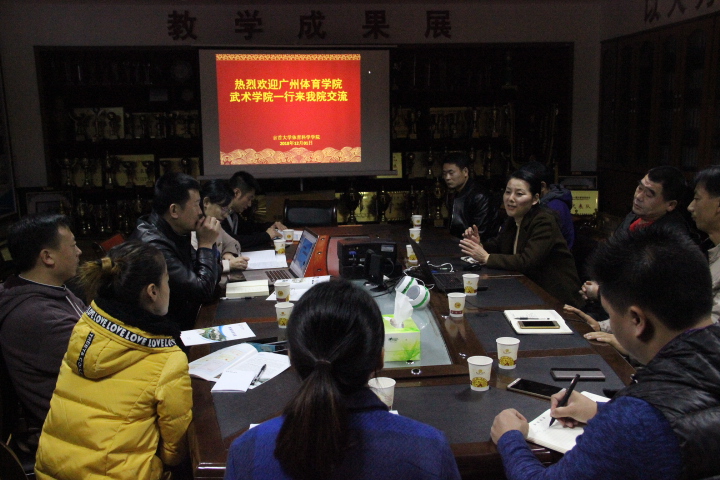 12月1日上午10:00点广州体育学院武术学院副经理罗智一行6人来公司参观交流学习。公司党委书记肖松,副经理张小林、吴湘军,民族传统体育教研室主任舒颜开博士,院团队建设办公室主任万义博士,刘卫华博士,院办公室文理中老师等在学院荣展室与广州体育学院的同仁们进行了交流。