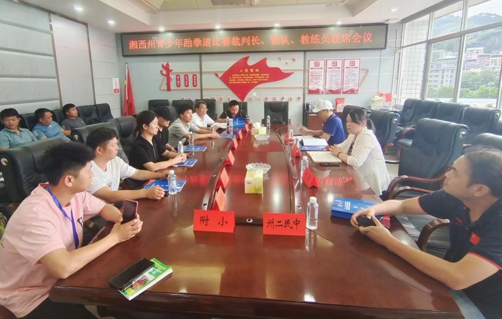 2023615日下午,在湘西自治州教育和体育局举行了湘西州青少年跆拳道比赛裁判长、领队、教练员联系会议,总裁判长陆盛华介绍了赛场布置、竞赛流程、裁判组织与培训、参赛运动员报名、编排工作等情况。同时,举行了裁判员会议,宣布裁判员纪律与要求,强调本次比赛要遵守裁判员法则,精准执裁,公平公正,并对裁判员进行了业务培训与考核。